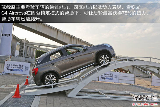駝峰路主要考驗車輛的通過能力、四驅(qū)能力以及動力表現(xiàn),雪鐵龍C4 Aircross在經(jīng)過這一關(guān)考驗時還是比較輕松的,當然這得益于其四驅(qū)鎖定模式,該模式可讓后輪最高獲得75%的扭力,幫助車輛迅速爬升。
