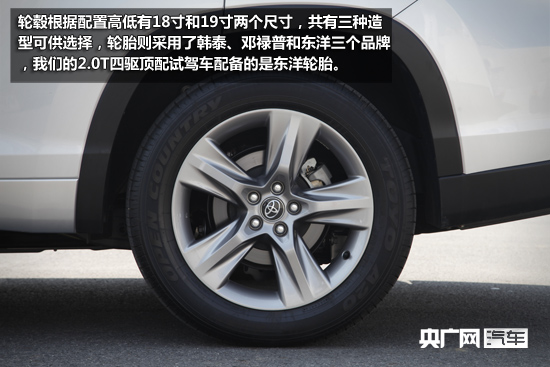 車(chē)輪輪轂根據(jù)配置高低有18寸和19寸兩個(gè)尺寸,共有三種輪轂造型可供選擇,輪胎則采用了韓泰、鄧祿普和東洋三個(gè)品牌,其中我們的2.0T四驅(qū)頂配試駕車(chē)配備的是東洋輪胎。如果想辨識(shí)全新漢蘭達(dá)是2.0T版還是3.5L V6版,最容易的辦法就是看尾標(biāo),2.0T版的尾標(biāo)是D-4ST,而3.5L V6版則清晰的表明了V6(六缸發(fā)動(dòng)機(jī))身份。