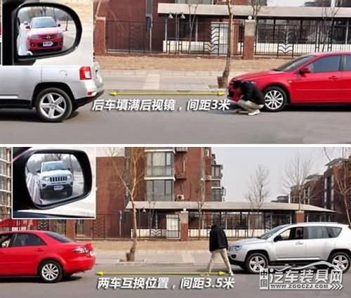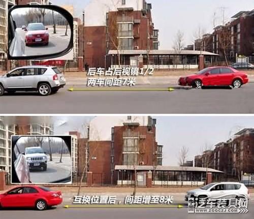 小車(chē)在前,SUV在后:當(dāng)后車(chē)充滿(mǎn)后視鏡的2/3時(shí),前后車(chē)距為8米左右。