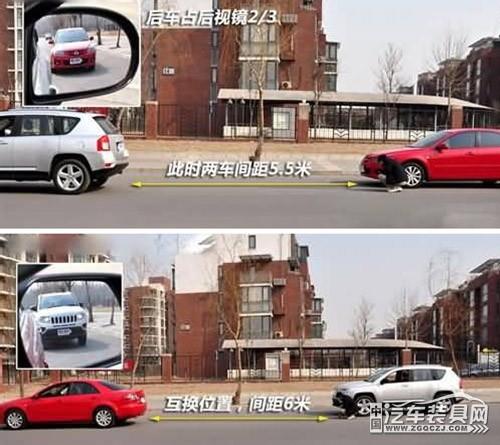 小車(chē)在前,SUV在后:當(dāng)后車(chē)充滿(mǎn)后視鏡的2/3時(shí),前后車(chē)距為6米左右。