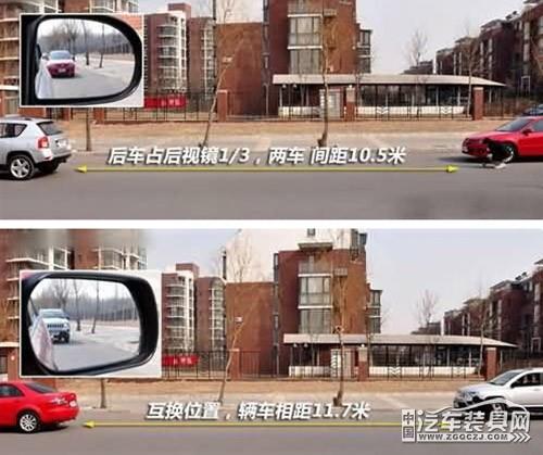 小車(chē)在前,SUV在后:當(dāng)后車(chē)充滿(mǎn)后視鏡的1/3時(shí),前后車(chē)距為11.7米左右。