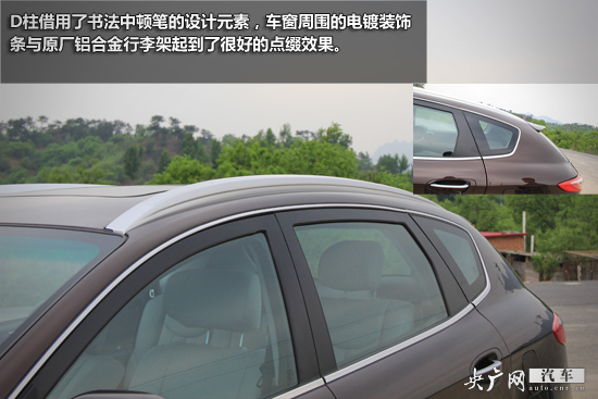 新大7腰線飽滿,老款后視鏡上的轉(zhuǎn)向燈被移到了前翼子板上,與前后門把手形成自然向上的線條。D柱借用了書法中頓筆的設(shè)計(jì)元素,車窗周圍的電鍍裝飾條與原廠鋁合金行李架起到了很好的點(diǎn)綴效果。