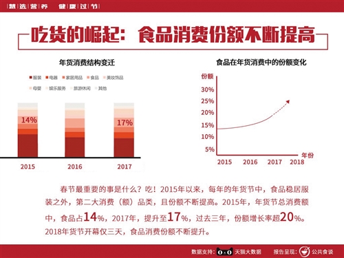 據(jù)科信食品與營養(yǎng)信息交流中心副主任鐘凱介紹,2015年至2018年天貓年貨節(jié)大數(shù)據(jù)顯示,公眾在線采購的食品類消費(fèi)額占比不斷提升,且食物種類也日趨多樣化。