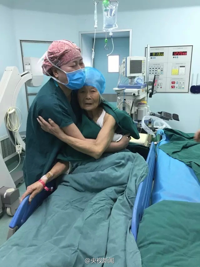 27日山西長治醫(yī)學(xué)院附屬和濟醫(yī)院手術(shù)室,82歲的閆招根老人因骨折即將手術(shù),可她恐懼不安,全身顫抖,眼淚在眼圈里打轉(zhuǎn)。護士趙凱麗緊緊抱住她說:“別怕奶奶,睡一覺,我們一直在! 在她懷里,老人慢慢放松甚至聊起了家常。最終手術(shù)成功完成。