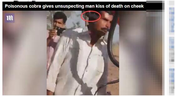 根據(jù)英國《每日郵報》報道,這起意外發(fā)生在印度的久德浦爾市(Jodhpur),該男子原本在觀看舞蛇人的表演,舞蛇人把眼鏡蛇繞到該男子脖子上,這舉動激怒了眼鏡蛇,于是蛇咬了男子的臉頰一口。