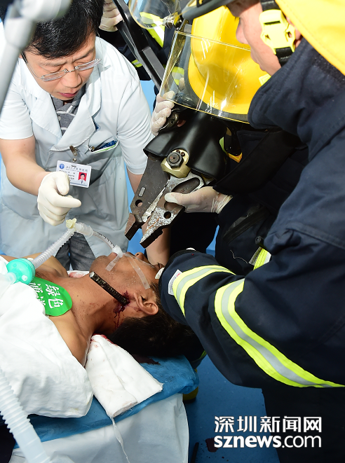 消防員和醫(yī)療人員消防員齊上陣,先行將傷者的顱外鋼筋切除