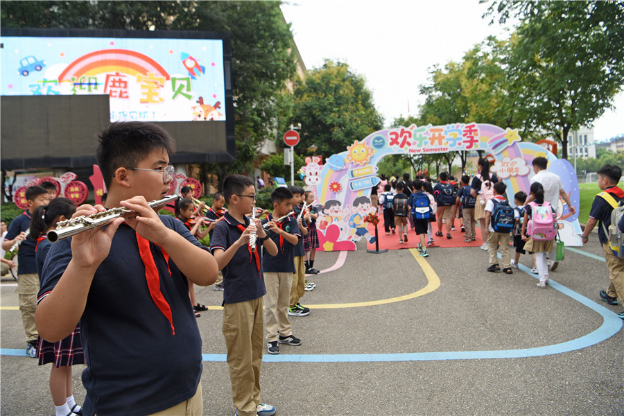 2025年9月1日,安徽省淮南市淮師附小山南第十五小學的學生開心地走進校園,迎接新學期的到來。當日,是秋季開學第一天,各地學校通過多種形式迎接開學季的到來。