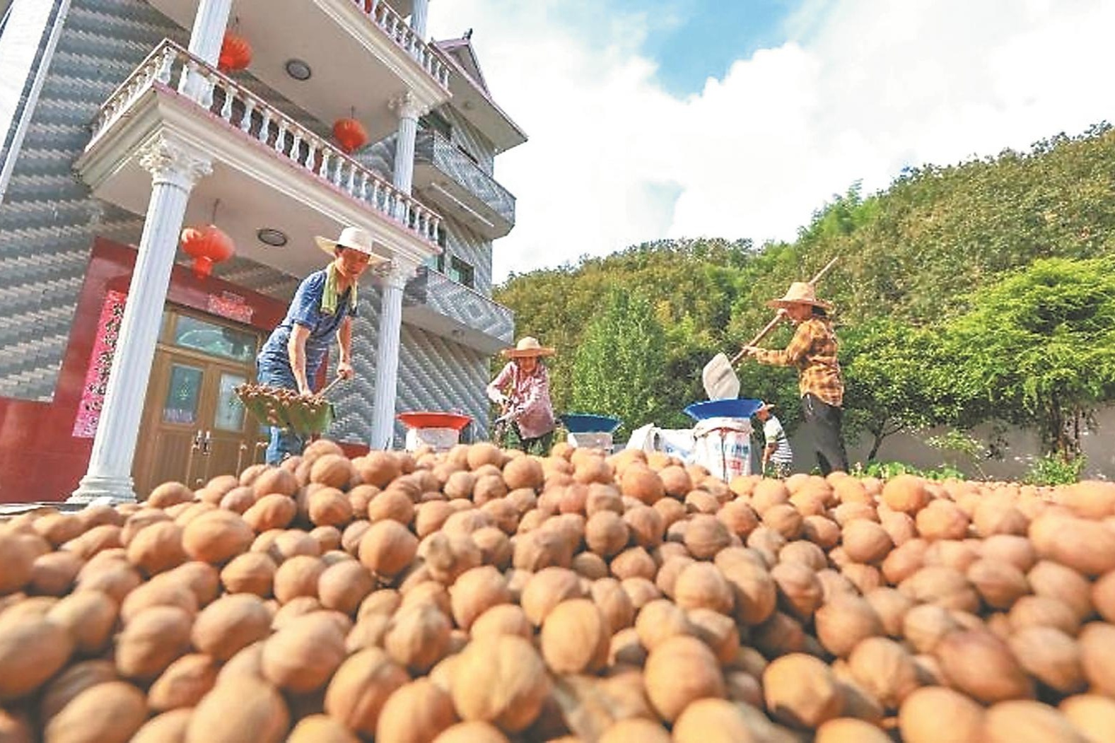 歙縣金川鄉(xiāng)伏黃村,村民在晾曬新收獲的山核桃。