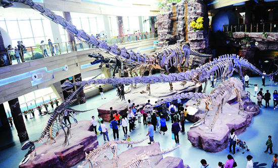 ◆ 10月1日,位于合肥市政務(wù)區(qū)的安徽省地質(zhì)博物館內(nèi),人們?cè)趨⒂^大型恐龍骨架。當(dāng)日是國(guó)慶假期第一天,許多市民帶著孩子走進(jìn)科普?qǐng)鲳^,學(xué)習(xí)知識(shí),開闊眼界。徐旻昊攝