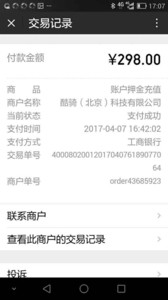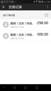 昨日中午,徐女士展示了當天所用的手機,上面保留了當天交易的各種截圖,從截圖上可以看到,在16:33分和16:42分,她分別被扣款300元和298元。該扣款記錄在微信上還有保留信息,在微信交易記錄中顯示,300元(2元為預繳騎車費)和298元押金被支付給了酷騎(北京)科技有限公司,顯示狀態(tài)為“支付成功”。