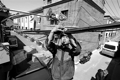 走進(jìn)西總布胡同,抬頭望去,粗細(xì)不一、長(zhǎng)短各異的架空線如同蛛網(wǎng)般橫七豎八地覆蓋在胡同上空!斑@些密密麻麻的線,有網(wǎng)線、有線電視線、電話線、電力的線,還有路燈線。”東城區(qū)城管委市政科孫哲說(shuō)。