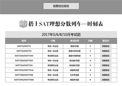 北青報記者上網(wǎng)搜索“SAT考團”,十幾頁各式教育機構(gòu)組織的“SAT考團”就讓人挑花眼,酒店、機票、輔導(dǎo)、報名……這個看似麻煩的跨境趕考在“SAT考團”的安排中貌似已經(jīng)發(fā)展成熟。