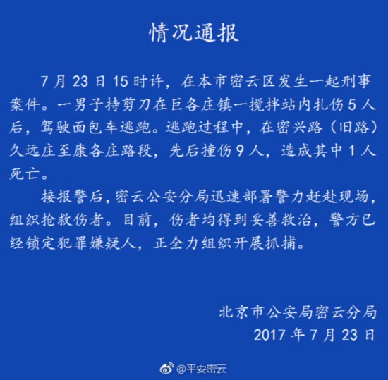 北京市公安局密云分局官方微博23日晚通報(bào)一起刑事案件,一男子持剪刀扎傷5人后逃跑,并在駕車逃跑過程中撞傷9人,其中1人死亡。目前,警方已鎖定犯罪嫌疑人,正全力組織開展抓捕。