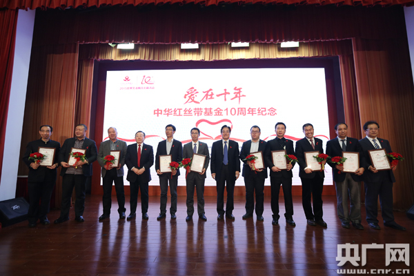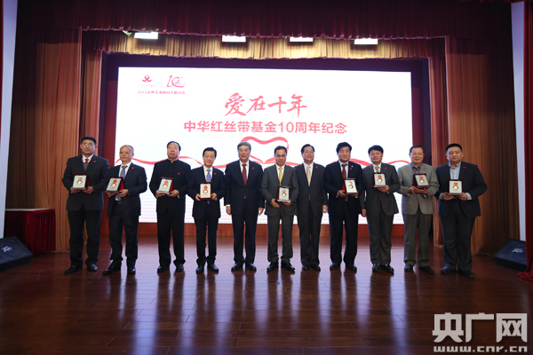 2015年11月30日,在第28個(gè)世界艾滋病日來臨前夕,中華紅絲帶基金“愛在十年”十周年紀(jì)念活動在京舉行,向全社會發(fā)布紅絲帶10年來防艾工作成果,并向?yàn)榉腊ぷ髯龀鲐暙I(xiàn)的愛心人士、基層工作機(jī)構(gòu)頒發(fā)“紅絲帶十年獎(jiǎng)”,并向?yàn)榘滩》揽刈龀鐾怀鲐暙I(xiàn)的愛心企業(yè)家、社會力量、公眾人士、感染者代表頒發(fā)第四屆“感動紅絲帶獎(jiǎng)”。全國工商聯(lián)名譽(yù)主席、中華紅絲帶基金名譽(yù)理事長黃孟復(fù),國家衛(wèi)計(jì)委副主任、國家中醫(yī)藥管理局局長、國務(wù)院防治艾滋病工作委員會辦公室主任王國強(qiáng),世界衛(wèi)生組織駐華代表施賀德,全國工商聯(lián)副主席、中華紅絲帶基金理事長謝經(jīng)榮,中國人民對外友好協(xié)會副會長謝元,全國政協(xié)經(jīng)濟(jì)委員會副主任、世茂集團(tuán)董事局主席、基金執(zhí)行理事長許榮茂,全國工商聯(lián)副主席、漢能控股集團(tuán)董事局主席、基金副理事長李河君,原衛(wèi)生部副部長、基金副理事長彭玉,全國工商聯(lián)原常務(wù)副主席孫安民,全國工商聯(lián)原副主席張龍之,全國工商聯(lián)原副主席、基金監(jiān)事長瞿懷明,全國工商聯(lián)原副主席張?jiān),國?wù)院參事、中國光彩事業(yè)基金會理事長謝伯陽以及基金形象大使白巖松,預(yù)防艾滋病宣傳員、中央電視臺主持人周濤,基金涼山項(xiàng)目關(guān)愛大使、中央電視臺主持人沙瑪阿果,表演藝術(shù)家侯耀華等領(lǐng)導(dǎo)和嘉賓出席此次活動。