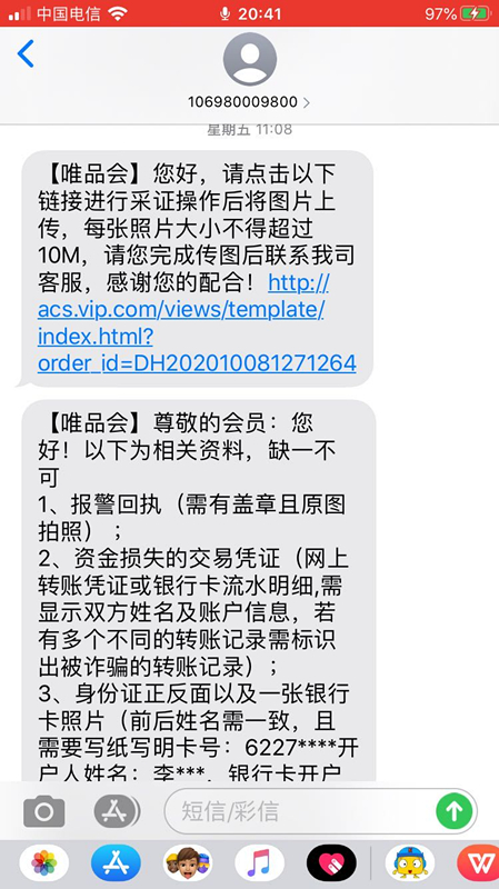 被騙后,受害者除了第一時間向警方報案外,還與唯品會聯(lián)絡(luò),質(zhì)疑其為何會把自己的隱私泄露?幾位受害人告訴記者,在他們向唯品會提交手持身份證照片等隱私數(shù)據(jù)后,唯品會向部分被騙用戶“墊付”了損失,并要求他們承諾,一旦警方破案拿到被騙款項,返還墊付款項。但李女士認為,把手持身份證照片給到唯品會,無疑又增加了一層隱私泄露的風險。李女士說:“承諾書的話就是本人身份證號、聯(lián)系電話、地址,本人在唯品會購物后,因輕信不法分子遭遇網(wǎng)絡(luò)詐騙,本人損失為多少。本人于幾月幾日向警方報案,報警回執(zhí),現(xiàn)在唯品會從客戶體驗角度出發(fā),預(yù)先向本人墊付,后面就是本人向唯品會承諾,如警方后續(xù)追款成功,本人將向唯品會退還警方追款成功的金額,否則唯品會有權(quán)通過法律途徑向本人予以追索全部墊付款。承諾人身份證號這些!
