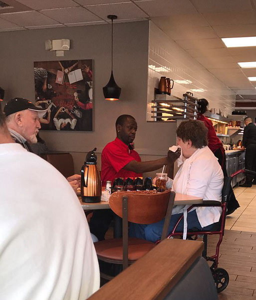 照片中,托馬斯一邊幫助行動不便的殘疾顧客進食,一邊輕輕地用餐巾幫她擦拭嘴角,十分細致耐心。這張照片是由餐廳內另一位顧客克希婭?多特森拍攝的,克希婭將這治愈人心的一幕發(fā)送給了托馬斯所在連鎖餐廳的“臉譜”官方帳號,引起了網(wǎng)友和媒體的廣泛關注。