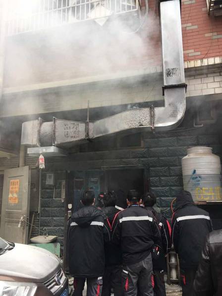當(dāng)時(shí)飯店還沒(méi)有開(kāi)門,兩人圍著飯店找了一圈才發(fā)現(xiàn),是后門廚房的油煙機(jī)著火了。火勢(shì)已經(jīng)很大,兩人沒(méi)多想,立馬跑回單位取滅火器,并呼叫救援。再次折回的二人抱著滅火器就沖進(jìn)了火場(chǎng)。