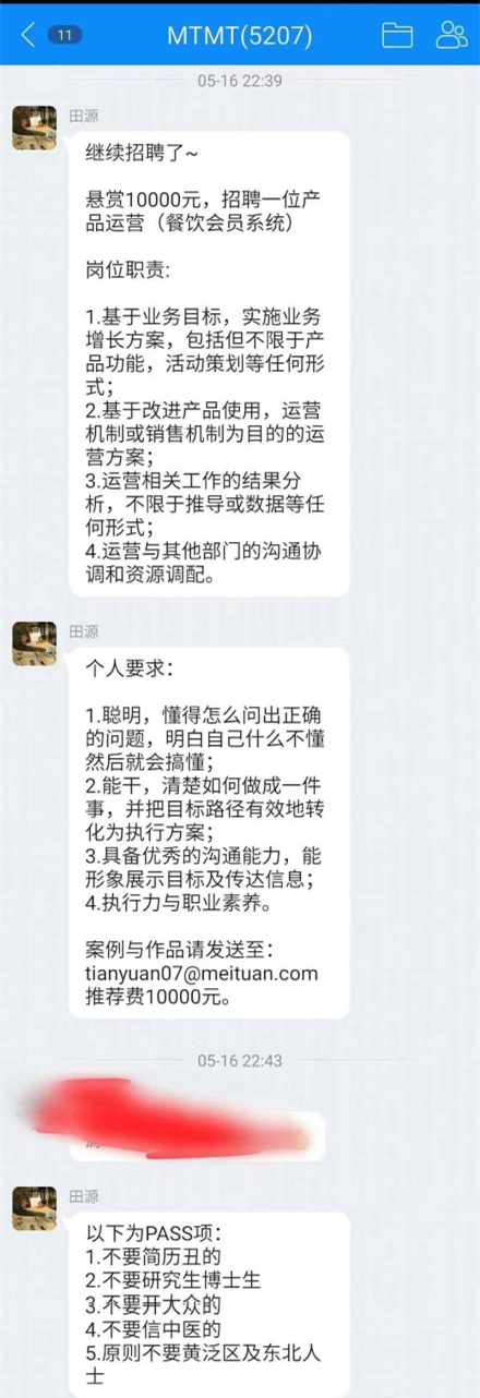 從微博爆料出來的截圖上看,這則招聘信息是發(fā)布在標(biāo)注為“MTMT”的qq群里。發(fā)布人在群里的名字叫田源,信息上稱“懸賞一萬,招聘一位產(chǎn)品運(yùn)營”,崗位職責(zé)是“基于業(yè)務(wù)目標(biāo),實(shí)施業(yè)務(wù)增長方案”等,發(fā)布者的個人要求是,“聰明,能干,具有執(zhí)行力與職業(yè)素養(yǎng)”等。在這兩條信息后,發(fā)布者還發(fā)布了5條限制,說“不要簡歷丑的,不要研究生博士生,不要開大眾的,不要信中醫(yī)的,原則不要黃泛區(qū)及東北人士”。