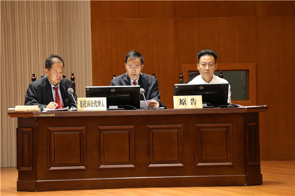 庭審現(xiàn)場:濮陽市市長楊青玖(右一)代表原告出庭,并在現(xiàn)場發(fā)表陳述意見(央廣網(wǎng)發(fā) 濮陽市中級人民法院供圖)