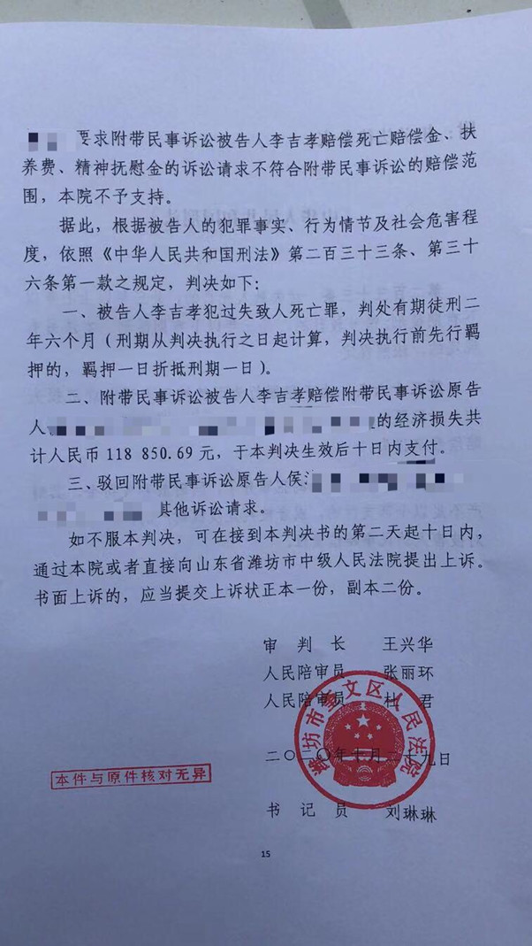 侯女士提到的酒駕問題,記者在一審判決中看到李吉孝幾位同車人員的口供“四個人喝了兩瓶酒”,除此之外,未見血液、呼氣等檢測證據。李洋說,父親說自己沒有喝酒,“同桌的人確實是給他的酒杯里倒了酒,但那幾天父親身體極度不好,吃了藥是不能喝酒的。因為當時有人過生日,(同桌的人)說不管喝不喝都要倒著。我們報了警之后,警察沒有找我們,我們不知道該怎么去證明自己,是不是應該去抽血、吹酒精測試。我父親作為一個駕車很多年的司機來,他是知道的,而且查的那么嚴,他不可能(酒駕)的!