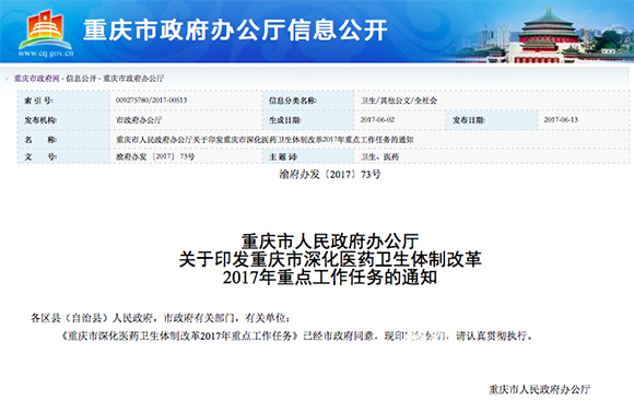 (記者 黃宇)13日,重慶市政府網(wǎng)公布了《重慶市人民政府辦公廳關(guān)于印發(fā)重慶市深化醫(yī)藥衛(wèi)生體制改革2017年重點(diǎn)工作任務(wù)的通知》(以下簡稱《通知》),明確了全面推進(jìn)公立醫(yī)院綜合改革的時間和范圍,要求在2017年8月底前,所有公立醫(yī)院啟動改革,全面取消藥品加成(中藥飲片除外),建立公立醫(yī)院由服務(wù)收費(fèi)和政府補(bǔ)助兩個渠道補(bǔ)償?shù)男聶C(jī)制,推動新舊運(yùn)行機(jī)制平穩(wěn)轉(zhuǎn)換。