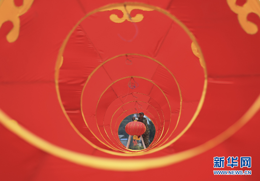 每到過年,重慶的大街小巷都會掛上火紅的燈籠以及五彩繽紛的裝飾,給新年帶來歡樂喜慶的氛圍。但是,在重慶迎春燈飾的背后,卻是燈匠工人辛勤的付出。因為他們,市民才能欣賞到這難得的新年美景。圖為工人師傅在重慶市北碚區(qū)縉云廣場安裝燈籠。新華網(wǎng)發(fā) (秦廷富攝)