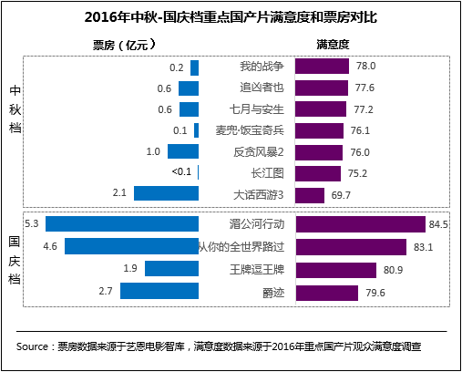 2016年國慶檔以15.79億元票房、5083萬人次的成績落幕。票房雖然較2015年“史上最強國慶檔”的18.6億元票房有差距,但觀眾滿意度卻不降反升,足以顯見,中國電影界追求創(chuàng)作質(zhì)量的努力正在逐步顯現(xiàn)成果。