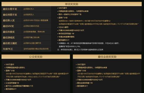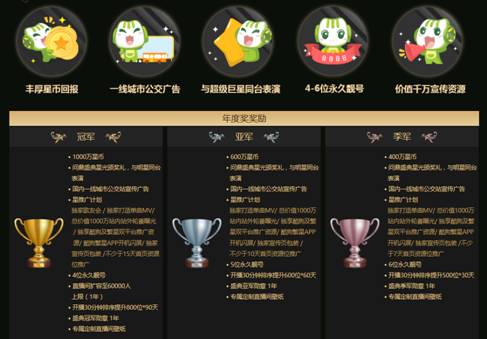 與往年相比,今年的盛典總決選陣容更加華麗浩大。面對(duì)井噴式增長的用戶和藝人,酷狗繁星直播不斷嘗試新的方式,來吸納發(fā)掘更多有潛質(zhì)的優(yōu)秀音樂藝人,今年總決選更增設(shè)了最佳MV獎(jiǎng)、最佳星主播獎(jiǎng)和年度PK王等多個(gè)單項(xiàng)獎(jiǎng)。同時(shí),獎(jiǎng)勵(lì)大升級(jí),豐厚到令人難以置信!除了百萬星幣獎(jiǎng)勵(lì)之外,還提供價(jià)值千萬的全國一線城市廣告宣傳,真正讓優(yōu)秀的繁星藝人實(shí)現(xiàn)夢想。