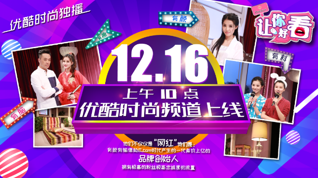 12月16日,網(wǎng)紅美妝時尚脫口秀《讓你好看》獨(dú)家登錄優(yōu)酷。節(jié)目由“明星家庭演播室”的首席主持、60后“大叔”高源和時尚淘女郎、90后“蘿莉”滕雨佳聯(lián)合主持,每期邀請最火網(wǎng)紅探討時髦辛辣的熱門話題,分享最新美容私物,搭配“邊看邊買”的視頻購物體驗,為廣大女性網(wǎng)友帶來最簡單容易的變美秘訣,塑造新一代審美觀。