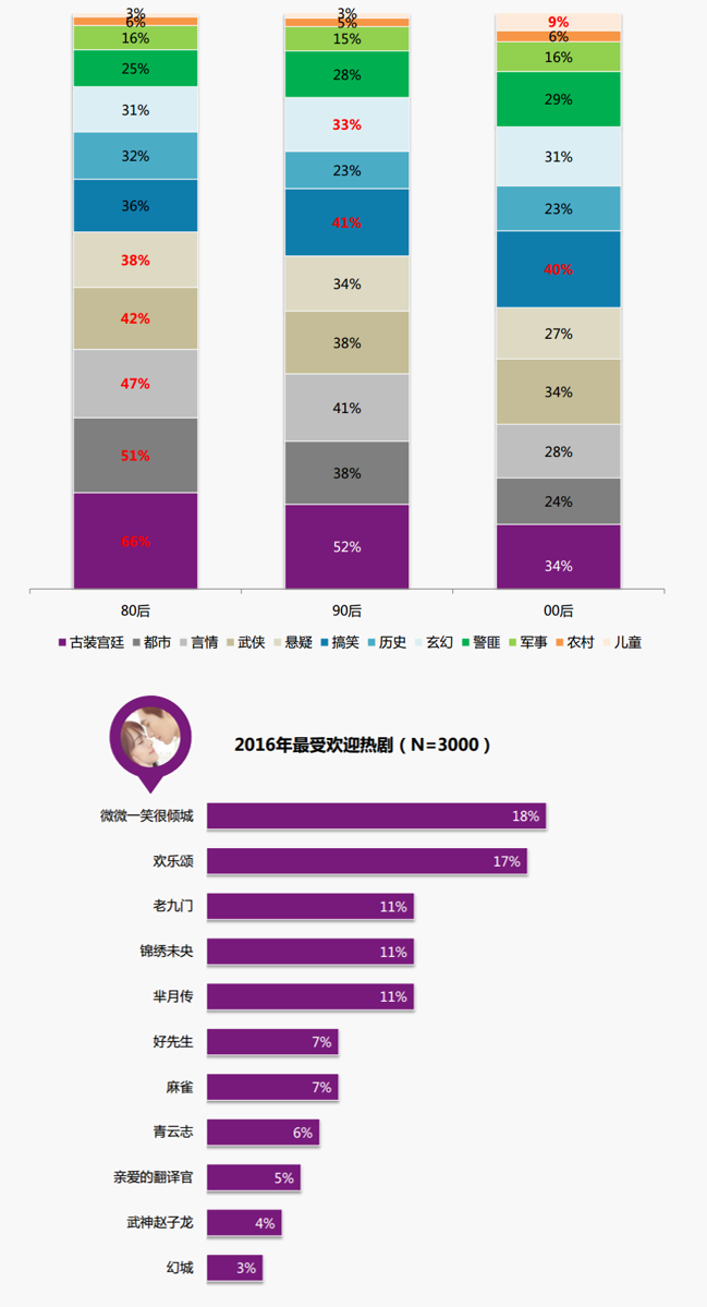 男人來(lái)自金星,女人來(lái)自火星?熱門IP改編的《三生三世十里桃花》,成功跨越性別審美差異,成2017年受眾最期待的作品之一。騰訊靠大手筆一舉拿下的《如懿傳》,深諳女性用戶喜好。比起押寶超級(jí)IP,優(yōu)酷2017不但包攬男性用戶最期待的TOP5,同時(shí)憑借《武動(dòng)乾坤》和《三生三世十里桃花》成功搶灘女性受眾,“頭部?jī)?nèi)容+垂直熱門”的多元化內(nèi)容布局更易霸屏。
