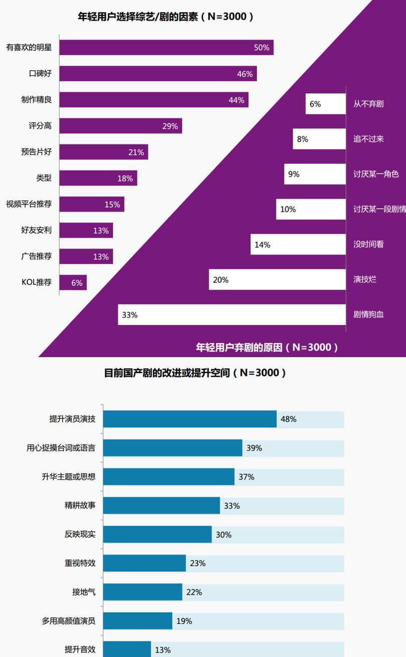 比較出乎意料的是,素以“顏控”來(lái)標(biāo)榜自己的年輕用戶,對(duì)好劇的評(píng)判標(biāo)準(zhǔn),早已不停留于“顏值即正義”,變得相當(dāng)挑剔。報(bào)告顯示,雖然明星依然是年輕用戶選劇的重要參考因素,但狗血?jiǎng)∏楹汀案腥恕毖菁紖s是用戶的第一棄劇理由。作為看著美劇、吃著漢堡長(zhǎng)大的一代,年輕用戶對(duì)網(wǎng)絡(luò)劇和網(wǎng)絡(luò)綜藝的鑒賞能力同步提升,單純依靠卡司、高顏值、“粉絲濾鏡”來(lái)制造爆款的粗暴邏輯已不適用于當(dāng)下。