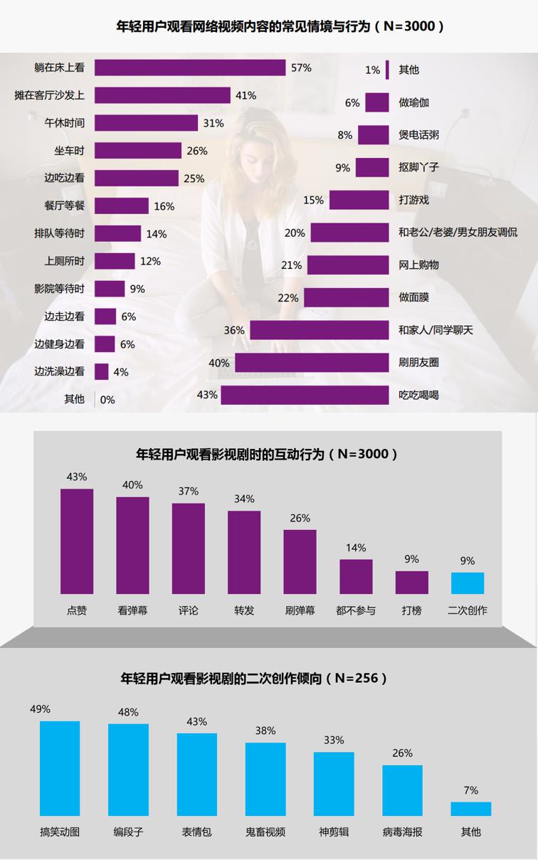 隨著劇綜類型的豐富、觀劇方式的多元化,觀看視頻在今天不僅是單純的娛樂(lè)手段,而成為年輕人生活的一種方式。尤其懶懶的癱在床上和沙發(fā)上看劇,是年輕人最愛的觀劇姿勢(shì)。同時(shí),數(shù)據(jù)顯示,100%的年輕人在看劇的同時(shí),會(huì)附帶其他娛樂(lè),其中吃吃喝喝、刷盆友圈是追劇最佳伴侶。