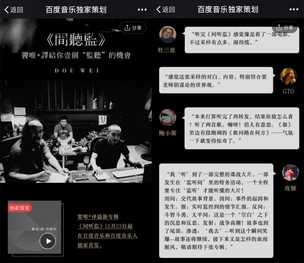 23日專輯首發(fā)后,百度音樂就發(fā)起了“竇唯+譯給你一個‘監(jiān)聽’的機(jī)會”專題活動,引導(dǎo)用戶發(fā)布從《間聽監(jiān)》中“監(jiān)聽”到的內(nèi)容評論,不少人都在專題后留下了自己的感受。