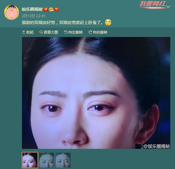 2月13日,有微博網(wǎng)友曬出景甜在《大唐榮耀》中表演的截圖,并評(píng)論:“景甜的雙眼皮好寬,雙眼皮寬度趕上臥蠶了!本疤馂樾聭驓 打完吊瓶就開(kāi)工!