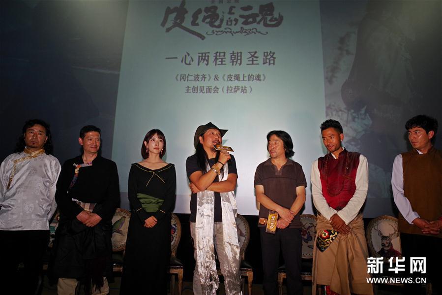 電影《皮繩上的魂》主創(chuàng)人員在拉薩首映式上與觀眾交流(7月24日攝)。 7月24日,西藏首部魔幻現(xiàn)實主義電影《皮繩上的魂》在拉薩舉行首映式。影片根據(jù)西藏作家扎西達娃的兩部短篇小說《西藏,系在皮繩結(jié)上的魂》和《去拉薩的路上》改編而成,由導(dǎo)演張楊執(zhí)導(dǎo),扎西達娃編劇。新華社記者 劉東君 攝