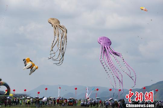 中新網(wǎng)貴州興仁9月27日電 (記者 劉鵬)巨型軟體八爪魚(yú)、巨型毛毛蟲(chóng)、顏色鮮艷的滾地龍、夜光風(fēng)箏……27日,來(lái)自全國(guó)各地的30余支風(fēng)箏隊(duì)伍帶來(lái)了300余只鮮艷奪目、形狀各異以及獨(dú)具地方特色的風(fēng)箏在貴州省興仁縣上演精彩的藍(lán)天派對(duì),共同歡慶當(dāng)?shù)亍鞍嗽掳恕泵缱屣L(fēng)情節(jié)。