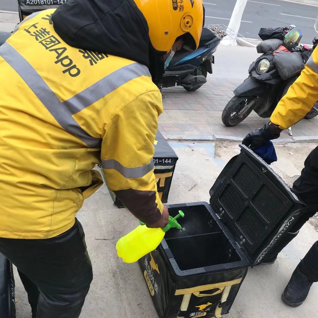 。ㄊ仪f騎手正在使用消毒液對(duì)配送箱進(jìn)行消毒)
