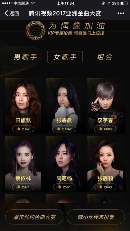 騰訊視頻LiveMusic作為在線演唱會第一平臺,與MTV音樂電視臺繼續(xù)強強聯(lián)合,攜手舉辦2017亞洲金曲大賞,互聯(lián)網(wǎng)基因和傳統(tǒng)音樂因素結(jié)合,開啟又一場無與倫比的互聯(lián)網(wǎng)音樂盛典。目前投票頁面已經(jīng)進入最后開放階段,考驗最燃粉絲的時刻到了,愛TA你就動動手指投票送TA去現(xiàn)場!