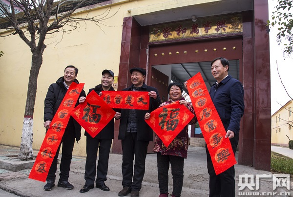 根據(jù)結(jié)尾字聲調(diào)的平仄區(qū)分出上聯(lián)和下聯(lián)后,還需注意張貼的形式。當人們面對春聯(lián)時,上聯(lián)在右首,下聯(lián)在左首。兩聯(lián)呈對稱的形式,貼在相對的位置。事實上,這多是對“框?qū)Α保ㄙN在左右門框上的春聯(lián))和“門心”(貼在左右門板上方居中位置的春聯(lián))的張貼要求。但“門心”與“框?qū)Α边略有不同。在書寫形式上,“門心”的兩聯(lián)各有兩列字,上聯(lián)是由右往左書寫,下聯(lián)是由左往右書寫,兩聯(lián)相對。張貼出去,像繁體的“門”字。比如,人們面對七言的“門心”時,春聯(lián)兩側(cè)各是四言,中間則是三言。如果稍加關(guān)注“門心”的平仄格式和書寫形式,一般不易張貼錯誤。