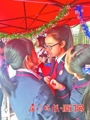 六年(2)班的陳錦璇和賴鷺宸在攝影社的攤位前玩起游戲,她們嘴里含著吸管,用吸管傳遞一個(gè)透明膠。經(jīng)過(guò)了三分鐘的嘗試,她們終于圓滿完成了任務(wù)!白彀投妓崴览!”陳錦璇開(kāi)心地說(shuō),工作人員在她們的積分卡上蓋了一個(gè)小紅章,據(jù)說(shuō),完成任務(wù)蓋滿12個(gè)紅章就可以拿到獎(jiǎng)品了。