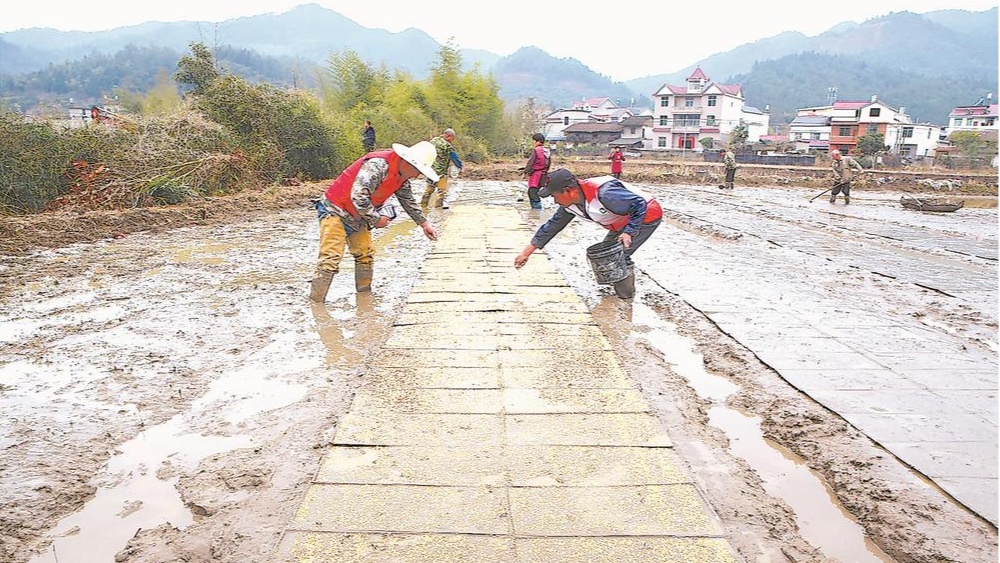 臺企南平市臺香生態(tài)農(nóng)業(yè)發(fā)展有限公司位于邵武市水北鎮(zhèn)龍斗村的水田里,村民在科技特派員的指導(dǎo)下,修整秧苗床,播撒優(yōu)質(zhì)超級稻種子。