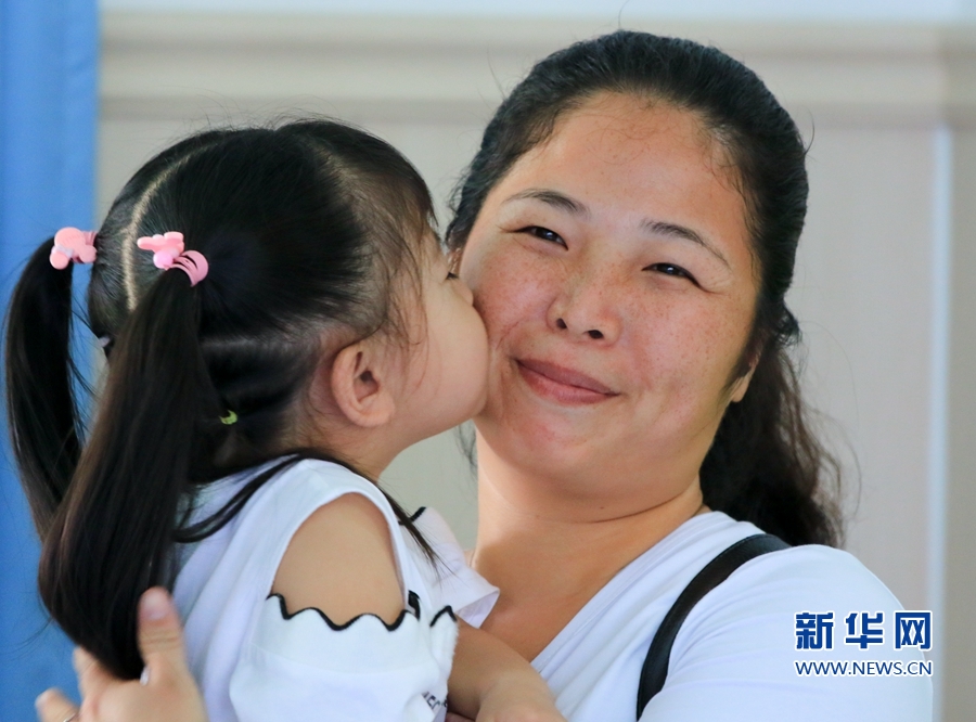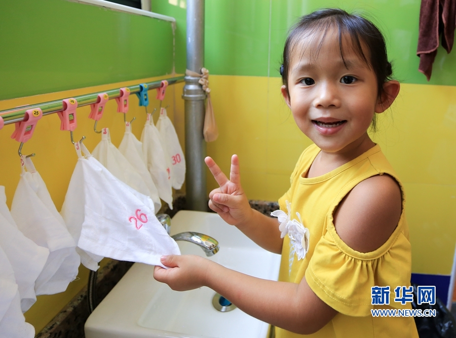 一名小女孩在洗手間找到自己的毛巾,十分高興。新華網(wǎng) 肖和勇 攝