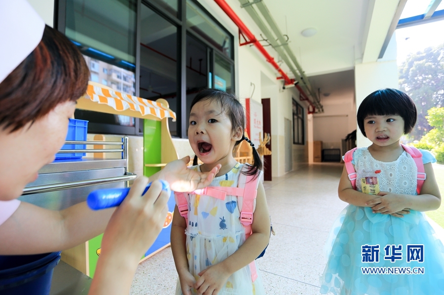 開園第一天的晨檢,讓小朋友有些意外。但這更像一個儀式,其意義在于幫助孩子們養(yǎng)成健康、衛(wèi)生的生活習(xí)慣。新華網(wǎng) 肖和勇 攝 -