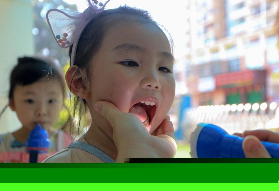 開園第一天晨檢,一名小女孩張開嘴露出一口潔白的牙齒。新華網(wǎng) 肖和勇 攝 -