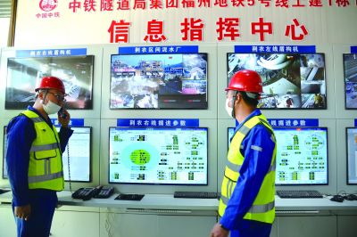 ▲ 起自閩侯荊溪鎮(zhèn)的福州地鐵5號(hào)線正在加快施工。圖為工作人員通過指揮中心進(jìn)行施工調(diào)度。林鑫 攝