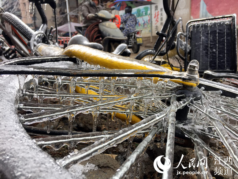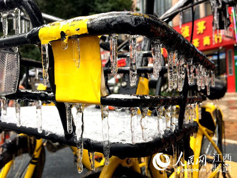 人民網(wǎng)南昌1月28日電(時雨)連日來,南昌遭遇低溫凍雨天氣,夜間的溫度跌至0℃以下。28日,本網(wǎng)在南昌街頭看到,低溫加凍雨使戶外的物體裹上了厚厚的“冰衣裳”,散落在街頭的各類共享單車不少已經(jīng)成為“冰雕”,車把手、車筐甚至車輪胎都結(jié)了冰,這些被“冰封”的共享單車?吭诼愤厽o人問津。 -