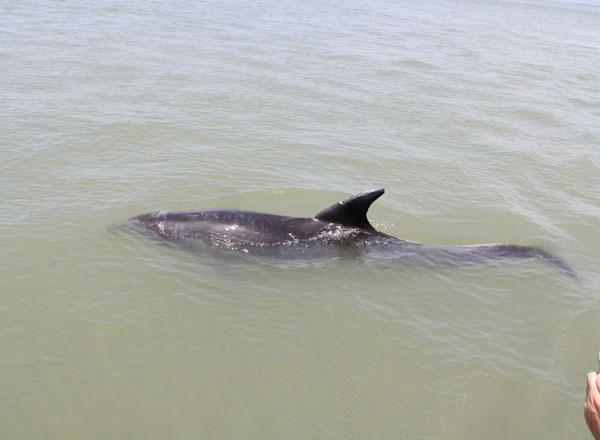 5月30日上午8時(shí)許,在海陵灣陽(yáng)江港附近海灘游玩的群眾看到海灘上有一只受困的黑色海豚,迅速報(bào)警求助?吹胶k嗌眢w露在水外,可能有生命危險(xiǎn),群眾一起將海豚往水里推了十幾米,但海豚仍不能游回大海,只能在近海淺水里慢速游動(dòng)。