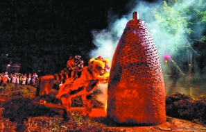 據(jù)介紹,今年的番塔高約4.68米,塔基直徑2.18米,由2400多塊新磚組成。砌番塔時很有講究,每一塊磚都是交錯相連。番塔每往上壘一層,就要往內(nèi)部收緊一圈,最上層頂端僅留一個直徑約20厘米的小孔。這樣類似“火山噴發(fā)”結構的塔身,能夠讓火星和火苗在一瞬間就從頂端的小孔噴涌而出,最高可噴出2米。