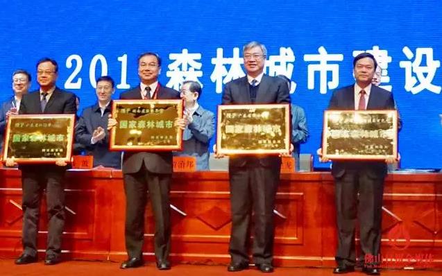 佛山市委書記魯毅(右二)、江門市長劉毅(左一)接受“國家森林城市”授牌。