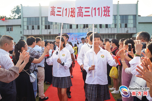 鮮花、拱門、紅地毯……16日,廣東實(shí)驗(yàn)中學(xué)附屬天河學(xué)校(下稱“省實(shí)附中”)室內(nèi)體育館張燈結(jié)彩,省實(shí)附中2018屆高三學(xué)子在這里舉行成人禮。